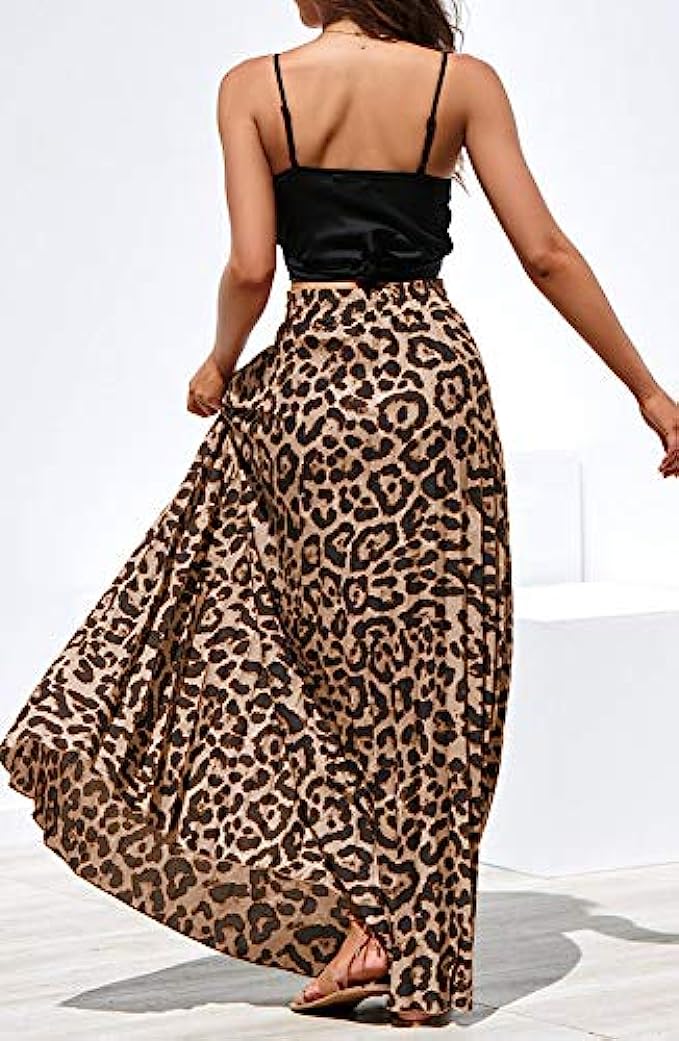 Womens Maxi Skirt Leopard Print Chiffon Beach Pleated High Waisted A-Line Long Skirts